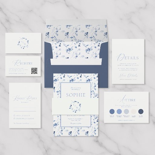 The front features a refined minimalist layout with soft blue calligraphy, while the back is adorned with a delicate watercolor floral pattern from the Dusty Blue Fine Art Floral Wedding Collection.