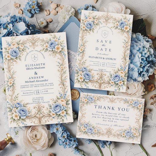 dusty blue weddingblue rose floralsbaroque gold scrollworkvintage european styleivory sage greeneryromantic classic themeornate floral framepastel blue elegancesymmetrical garden bordertimeless luxury aesthetic