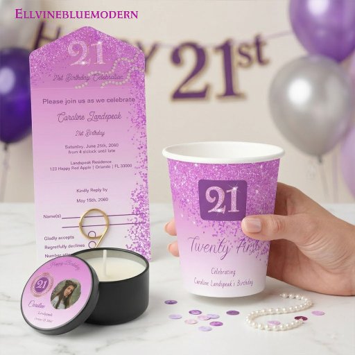 The sparkling Pink Glitter wrapping paper, also features a unique Gold and Pink Glitter, number 21, displayed on a modern plain circle, forming a charming wheel with Pink dots and lines. Glitter Stripes with Pink colors add a finishing touch to the celebration of her Twenty-First Birthday.