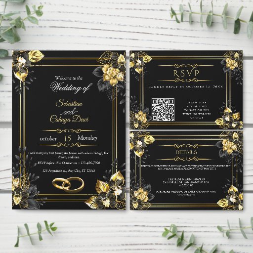 Elegant black and gold summer wedding 招待状 (この独立クリエイターのコレクションをカスタマイズ。)Elegant black and gold summer wedding 招待状 (裏面)Elegant black and gold summer wedding 招待状 (スタンド正面)
