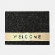 A classy black glitter welcome door mat to invite your guests in style. The faux black glitter look doormat has a silver band with the welcome words ,that you can customize ,to make it unique and special.
