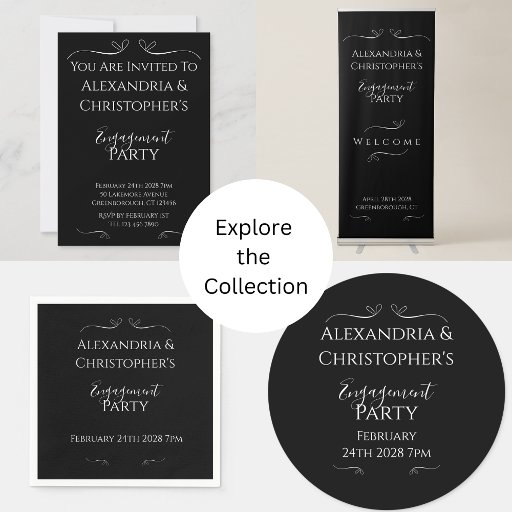 This elegant black and white design features a formal layout with chic script. Perfect for a modern couple, it creates a sophisticated look for your engagement party celebration. Contact the designer for help with personalization and customization.