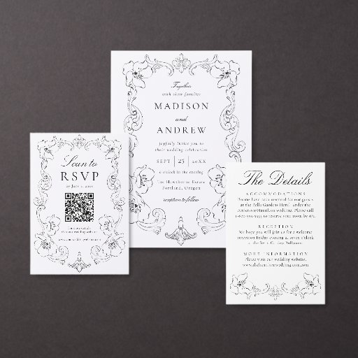 Share your wedding plans in timeless style with this Elegant Ornate Floral Frame Save the Date card. The design features your names and wedding date centered within an intricate vintage-inspired floral frame, illustrated in classic black for a refined and formal look. Graceful botanical elements and ornamental accents create a sophisticated border that evokes traditional stationery, while the balanced typography keeps the layout clean and elegant. Perfect for formal weddings, estate venues, historic settings, and couples drawn to classic black and white wedding stationery, this save the date offers a beautiful and memorable way to announce your celebration and let guests mark their calendars.