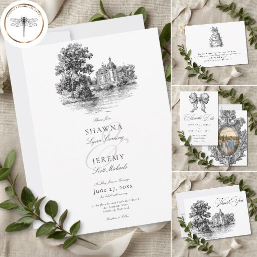 Make your wedding timeless with this elegant charcoal black vintage toile wedding thank you card design. Featuring a detailed manor and estate sketch by the water, it is perfect for a sophisticated ceremony. This classic look adds a refined touch to your historic home or garden celebration. Created by Simply Farmhouse Press.
