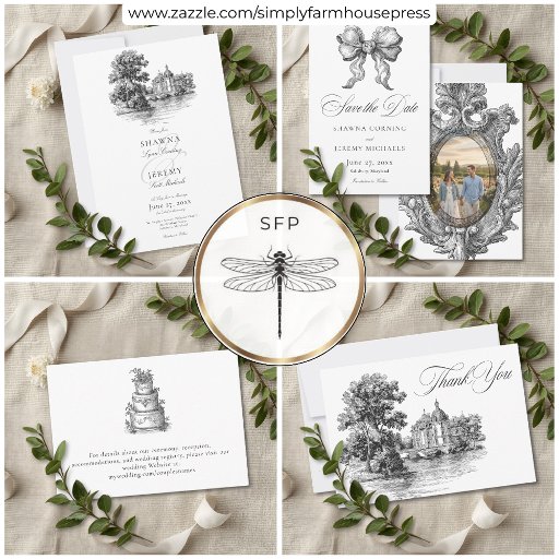 Make your wedding timeless with this elegant charcoal black vintage toile wedding thank you card design. Featuring a detailed manor and estate sketch by the water, it is perfect for a sophisticated ceremony. This classic look adds a refined touch to your historic home or garden celebration. Created by Simply Farmhouse Press.