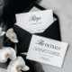 This elegant black and white wedding place card features refined serif and graceful script typography on a rich dark background, creating a timeless and sophisticated look. Designed for formal receptions and black-tie weddings, it perfectly complements a minimalist tablescape while maintaining a sense of luxury. Ideal for pairing with the full Sabrina wedding stationery suite, this design helps guide your guests to their seats with understated elegance. Fully customizable — edit names, table numbers, and layout to suit your event.