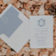 Elegant Blue Floral Crest Wedding Invitation with Striped Back