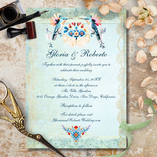The Elegant Blue Baroque Hummingbird Design captures the timeless charm of Mexican artistry blended with refined European flair. This exquisite wedding Thank You card features a delicate turquoise watercolor background adorned with graceful golden baroque scrolls and a hand-painted floral motif at the base, where a tiny hummingbird hovers among colorful blossoms. The design evokes the beauty of colonial-era craftsmanship, making it a perfect choice for couples celebrating a wedding filled with heritage, elegance, and heartfelt gratitude.
