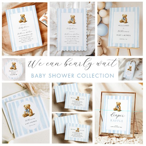 blue bear baby showerwe can bearly waitblue stripesbaby boyteddy bearbear themeelegantwatercolorbaby sprinklethick lines