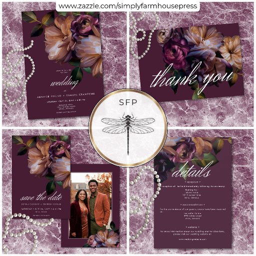 AVAILABLE WITH A QR CODE OR WITH OR WITHOUT DINNER CHOICES. Celebrate love in timeless elegance. Our captivating wedding invitation feature a sophisticated burgundy background, the perfect palette for a captivating bouquet. Imagine an arrangement, reminiscent of a Baroque masterpiece, painted in rich oil tones. Rust burgundy and soft blush blooms mingle with dark olive green foliage, creating a sense of quiet opulence. This enchanting design sets the stage for an intimate gathering filled with heartfelt moments and cherished memories. Created by Simply Farmhouse Press.