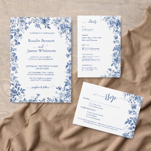 Complete your celebration with this Elegant Dusty Blue Toile Wedding Details Card. Designed with delicate blue botanical florals inspired by classic French toile, this insert beautifully organizes venue information, schedule, accommodations, and travel details in a refined and timeless layout. The soft dusty blue palette pairs perfectly with formal, estate, vineyard, and garden weddings, creating a cohesive and sophisticated stationery suite your guests will appreciate.