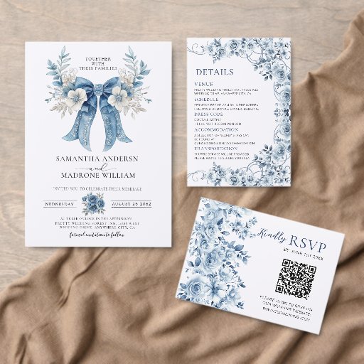 Timeless dusty blue wedding invitation with a romantic oversized bow, delicate watercolor florals in soft blues/whites, and elegant white rose accents. Classic calligraphy layout for easy personalization of names, date, time, venue & RSVP. Perfect "something blue" for sophisticated, romantic weddings — airy, luxurious, and fully customizable! 💙🤍