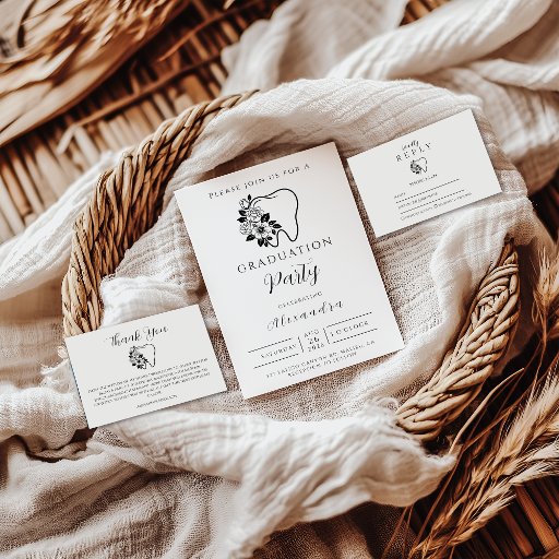 Celebrate your accomplishment in timeless style with this elegant black-and-white dental graduation design. The layout features a refined floral tooth illustration paired with modern typography, creating a clean and sophisticated aesthetic perfect for dental school graduates. Personalize all text to match your event details and create an unforgettable announcement to share with family and friends.