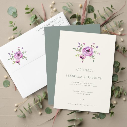 Celebrate timeless romance with this elegant floral wedding collection. Featuring delicate watercolor florals in soft lavender, blush, and greenery, each piece captures a sense of natural beauty and modern sophistication. Perfect for couples seeking a refined and cohesive wedding theme, this collection includes invitations, thank you cards, signage, wine labels, and more — all customizable to reflect your special day. The subtle floral details and elegant typography create a graceful, cohesive aesthetic that’s ideal for garden weddings, spring ceremonies, or any romantic celebration.