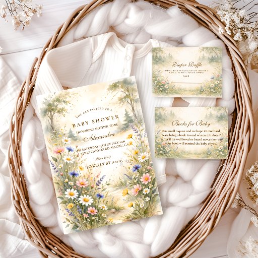 A soft watercolor meadow blooms across the bottom of this elegant design, featuring delicate daisies, blush cosmos, buttery yellow florals, and airy blue wildflowers. The warm ivory background and refined gold typography create a graceful balance between rustic charm and timeless sophistication. Inspired by sunlit fields and gentle summer breezes, this design feels romantic, fresh, and effortlessly classic. Perfect for a garden-inspired celebration with a refined, storybook touch.