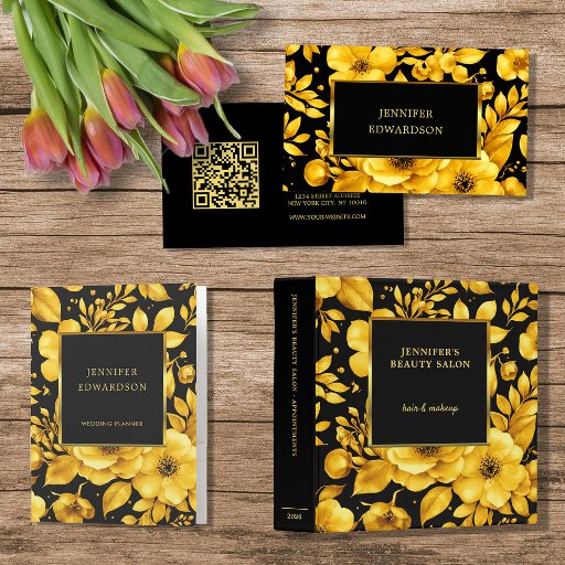 Elegant gold black flowers professional スクエア名刺