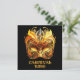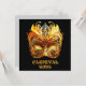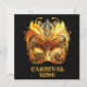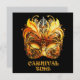 An ornate Venetian mask features intricate gold and black designs with vibrant yellow feathers and gold lettering. The craftsmanship showcases elegant scrollwork and vivid colors.