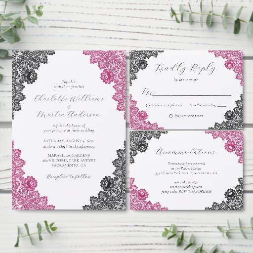 Elegant hot pink and black wedding invitation featuring elegant floral lace. Easily personalize this wedding card with your wedding details online.