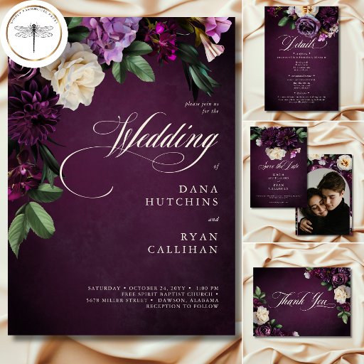 Step into a realm of exquisite elegance with our floral dark and moody wedding invitation. Designed to captivate the senses, this invitation boasts a striking burgundy background adorned with a breathtaking burst of florals in deep burgundy, lavender, lilac, creamy hues, complemented by lush dark green foliage. The creamy elegant script text delicately adds a touch of romance to the overall allure. Embrace the opulence of the rich tones and set the tone for your special day with this stunning invitation, sure to leave a lasting impression on your guests. Created by Simply Farmhouse Press.