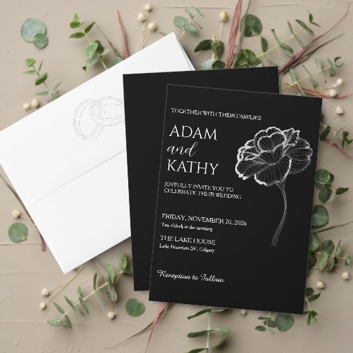 Set a dramatically beautiful table at your wedding reception with this stunning Black Botanical Wedding Menu Card - featuring beautiful white botanical line art on a rich black background, perfectly coordinated with your complete AK Aurora Black Botanical wedding stationery suite.