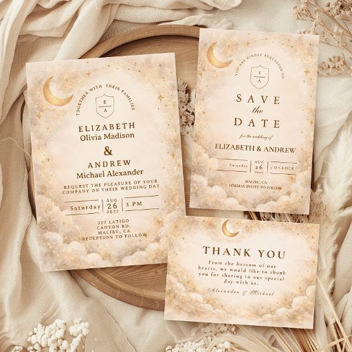 A refined celestial design featuring delicate crescent moons, scattered constellation stars, and a warm parchment-toned background. A thin gold border frames the layout, while elegant typography creates a timeless, sophisticated composition. The subtle vintage texture and balanced spacing give this piece a romantic, storybook feel without overwhelming the details. Perfect for couples who love classic elegance with a soft cosmic touch.