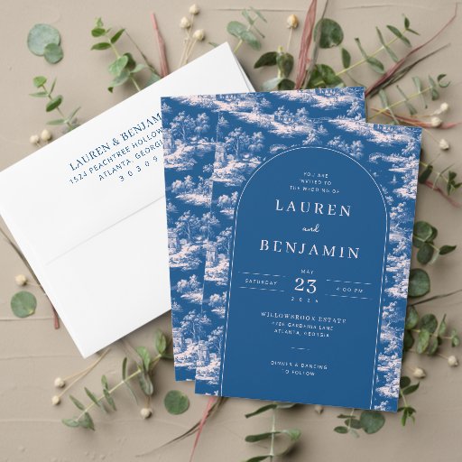 This is a classic style image featuring an elegant table number card for Lauren & Benjamin's wedding on May 23, 2026. The deep blue background is adorned with intricate white floral patterns that create a sophisticated and timeless look. At the center, the large, bold number "8" stands out in pristine white, surrounded by the names of the couple in a delicate script font. It exudes a sense of refined elegance and celebration, perfect for setting the tone at a formal event.
