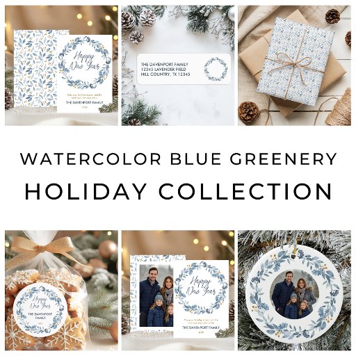 Elegant Christmas stickers featuring a blue watercolor wreath to personalize with your information and enhance your mailings and gifts this holiday season.
