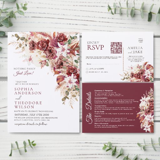 Make responding effortless with this elegant watercolor burgundy QR code wedding RSVP card, designed to match the Nothing Fancy, Just Love collection. Featuring romantic burgundy and blush watercolor florals with soft gold accents and sage eucalyptus greenery, this card blends timeless beauty with modern convenience.