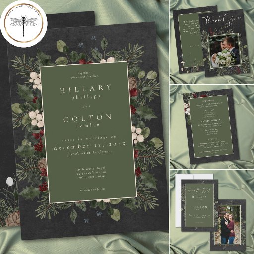 Introducing our enchanting winter wedding photo thank you card, where timeless elegance meets the beauty of the season. The rich charcoal black background, softly distressed with white accents, sets a captivating tone for your special day. In the dark sage green text area, your wedding details stand out, surrounded by a delicate cream frame that adds a touch of refinement. Embrace the spirit of winter with a breathtaking frame of lush greenery, featuring holly adorned with rich red berries, mistletoe with its delicate white berries, and the timeless allure of green pine. Created by Simply Farmhouse Press.