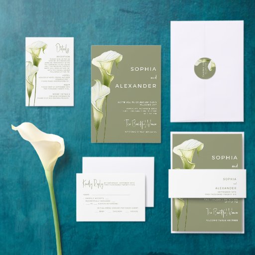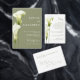 Enclosure Card Details for Weddings features a refined, minimalist style. Delicate calla lilies in soft green shades are depicted against a light background, creating an atmosphere of sophistication and tranquility. The design is modern, airy, and perfect for a stylish, romantic wedding.