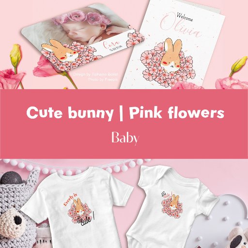Faire-part naissance lapin mignon en illustration avec fleurs à l'avant pour informer votre famille et vos amis de l'arrivée de bébé! De l'autre côté, il suffit de remplacer l'exemple d'image par votre photo préférée de votre nouveau-né et de personnaliser le texte des deux faces avec vos propres détails.