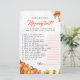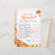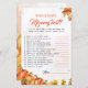 Discover who knows the mom-to-be best with this charming Fall-themed baby shower game card! Featuring a beautiful watercolor design of plump pumpkins and delicate autumn leaves, accented with subtle golden speckles, this game adds a warm and inviting touch to your celebration. Guests will love guessing the answers to fun questions about the expectant mother, making it a fantastic icebreaker and a source of laughter and cherished memories. Easily incorporate any specific event details or a special message to make this activity uniquely yours. Ideal for autumn baby showers, rustic gatherings, or harvest-inspired parties, ensuring everyone has a delightful time.