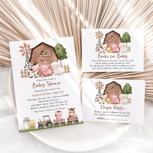 Add a personal touch to your baby shower celebration with these stylish and memorable party items! Design features farm animals (cow, sheep, pig, rooster, chicken) and brown barn on white background.