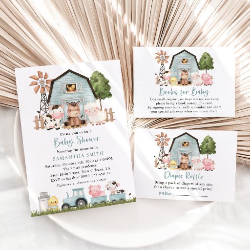 Add a personal touch to your baby shower celebration with these stylish and memorable party items! Design features farm animals (cow, horse, sheep, pig, rooster, chicken) and blue barn on white background.