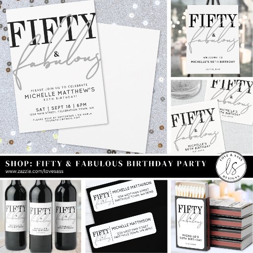 Celebrate in style with this modern elegant Fifty and Fabulous Birthday Party Invitation, perfect for marking a milestone in a chic, timeless way. The design features the word “FIFTY” in a bold white serif font, with “fabulous” written just below in shimmering gold foil for a stylish contrast. The name and date are also highlighted in matching gold foil for a touch of luxury.