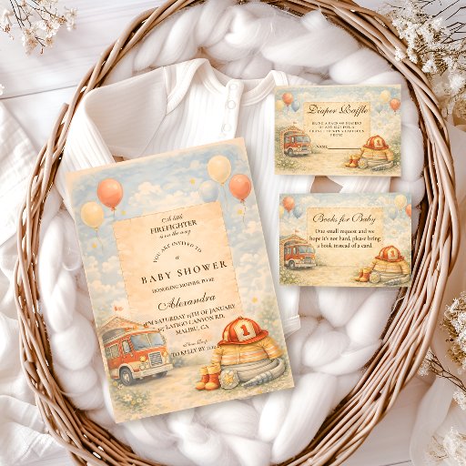 Celebrate a little hero on the way with this cute firefighter baby shower design, illustrated in a warm, storybook style. Featuring classic firefighter details like a helmet, jacket, boots, and fire truck accents, the artwork feels sweet, cozy, and timeless rather than loud or cartoonish.