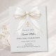 Invite guests with this sophisticated First Holy Communion invitation. The design features a luxurious ivory satin bow draped with delicate pearls and a shimmering gold cross set against a soft dove gray background. It is a beautiful choice for a young girl celebrating her sacred Catholic sacrament.
