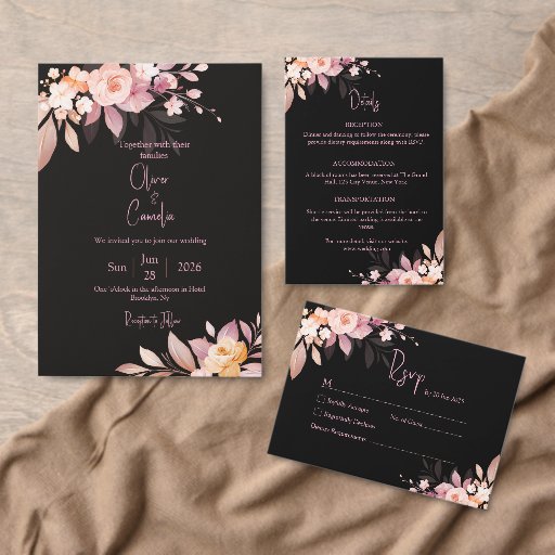 This thank-you card features soft blush and peach roses on a deep black background, creating a warm and romantic style that pairs beautifully with the rest of the Floral Black & Blush Rose wedding suite. The gentle floral artwork gives the card a soft and heartfelt feel, perfect for expressing your gratitude. The clean layout gives you space to write a thoughtful message for your guests and make them feel appreciated.