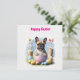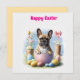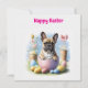französische Bulldogge wünscht Happy Easter mit vielen pastellfarben angemalten Eiern und einer rosa Schleife. Der niedliche Hund sitzt in einem Osterei und hat tolle Geschenke mitgebracht. Bunte Frühlingsblumen und ein blauer Himmel runden das schöne Tiermotiv ab. Für jeden Hundeliebhaber ein schönes Geschenk.