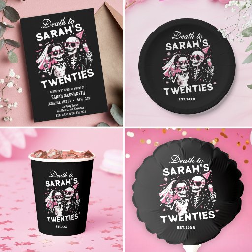 Say goodbye to your 20s in style! This bold black and pink skeleton invite sets the tone for a spooky-fun “Death to Your Twenties” birthday bash, customized for you.