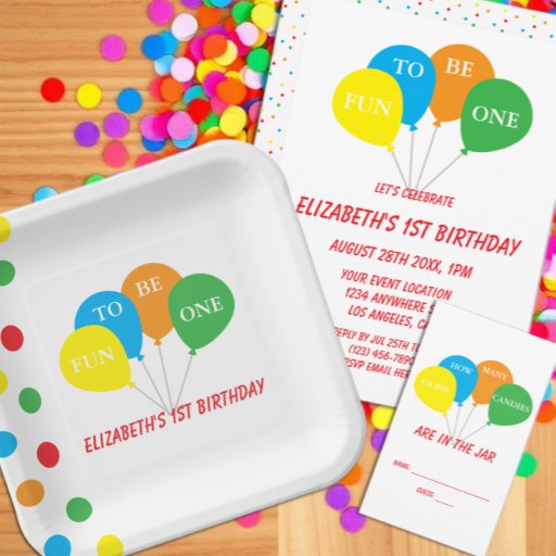 So much fun to be one! Colorful 1st birthday collection with balloons and confetti dots.