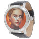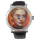 A girl with blue eyes on an orange background, dark black and crimson, photorealistic fantasies, personal iconography, detailed character design, shiny/glossy