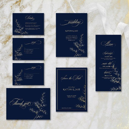 A navy colored wedding invitation with gold elements and botanicals.