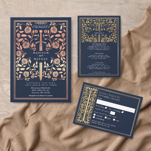 Celebrate your special day with these Royal Medieval Sword Wedding RSVP Cards against a blue background. You can customize this further by clicking on the "PERSONALIZE" button. PLEASE NOTE: The gold on this item is NOT real foil and is printed in flat colors