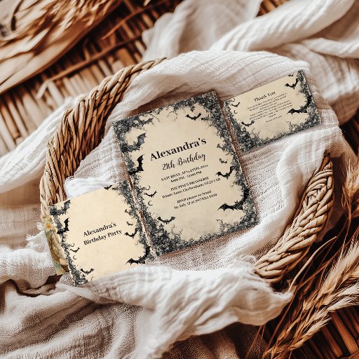 Step into a shadowy, atmospheric celebration with this Gothic arch–themed birthday design. Dark vines, swooping bats, and distressed parchment textures create an elegant yet mysterious mood. Perfect for anyone who loves gothic aesthetics, haunted romance, or midnight-themed events. The dramatic archway and detailed artwork make this design unforgettable—beautifully eerie, stylish, and ready for a standout celebration.