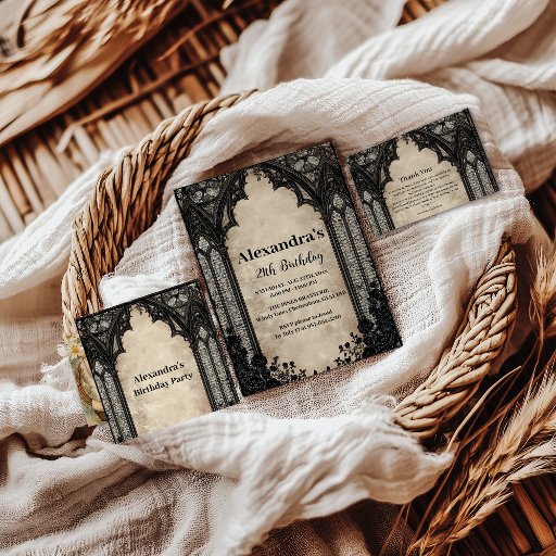 A dramatic gothic design featuring antique chandeliers, dark florals, and subtle webbed textures against an aged parchment backdrop. This atmospheric layout blends vintage elegance with a moody midnight aesthetic, perfect for anyone who loves dark romance, gothic glamour, or Victorian-inspired celebrations. Fully customizable text allows you to tailor every detail for your event.