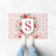 This Christmas door mat design has a preppy grandmillennial design featuring a floral crest surrounded with berries with a monogram letter in the center.