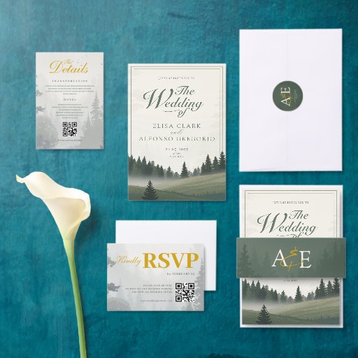 Green Forest Classic Watercolor Photo QR Wedding 招待状