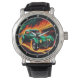 This bold watch face features a vintage-style green hot rod car, its lower half surrounded by intense orange and red flames, appearing to race on a dark road. The background includes dark, stormy-looking clouds that blend with the fiery hues, creating a dramatic and powerful scene for automotive enthusiasts.