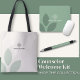 It doubles as the bag the rest of the welcome kit ships in — which means the first thing they open is also the thing they keep.
